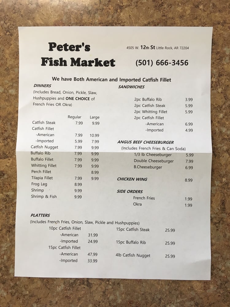 Welcome to Peter's Fish Market, a cherished hidden gem located at 4505 W 12th St, Little Rock, AR. This local favorite specializes in serving up some of the freshest catfish in the area, consistently praised for its thick fillets and crispy batter that make every bite a delight. Guests rave about the perfectly cooked fish inside, complemented by hush puppies with a hint of sweetness.
